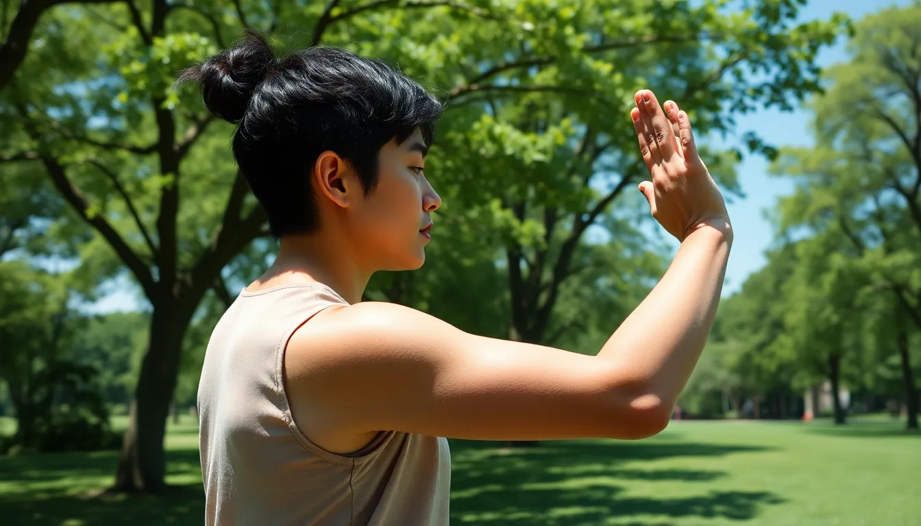 첫째, 옆구리 스트레칭입니다. 시원한 공원에서 실내에 갇히지 않고 스트레칭을 해보세요. 옆구리를 쭉 늘려주면 척추 주변 근육이 유연해지고, 측만증으로 인해 긴장된 근육이 완화됩니다. 운동 방법은 두 발은 어깨너비로 벌리고 한쪽 팔을 머리 위로 쭉 뻗으며 옆으로 기울이는 것입니다. 반대쪽도 동일하게 반복합니다.
